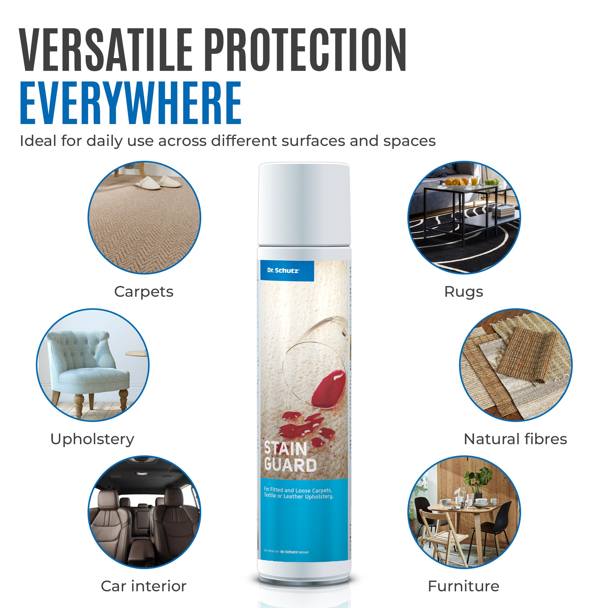 This carpet guard spray is ideal for use on wall-to-wall carpets, rugs, and upholstery, providing superior protection for both synthetic and natural fibres such as polyamide, polyacrylic, polyester, wool, cotton, and sisal. It also works as a fabric protector spray for smooth and rough surfaced leather seats and furniture, making it perfect for use at home, in the car, boat, or caravan.
